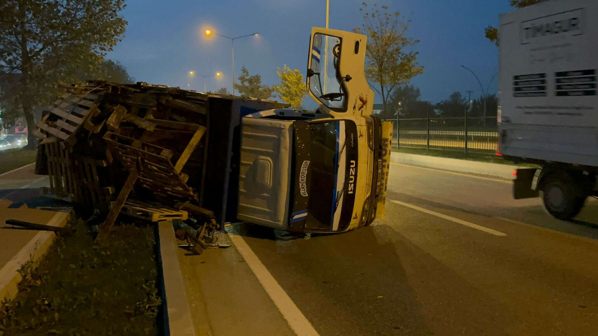 Kamyonetin kasasındaki paletler yola saçıldı. Kaza sonucu şans eseri yaralanan olmadı.
