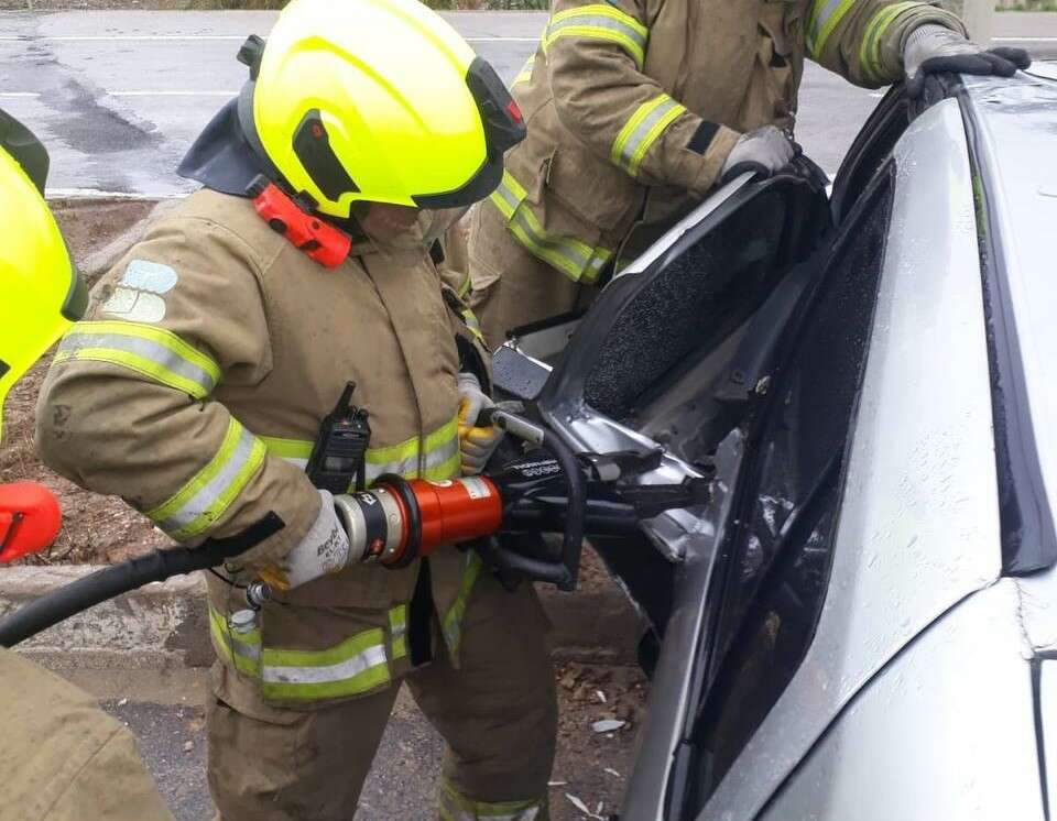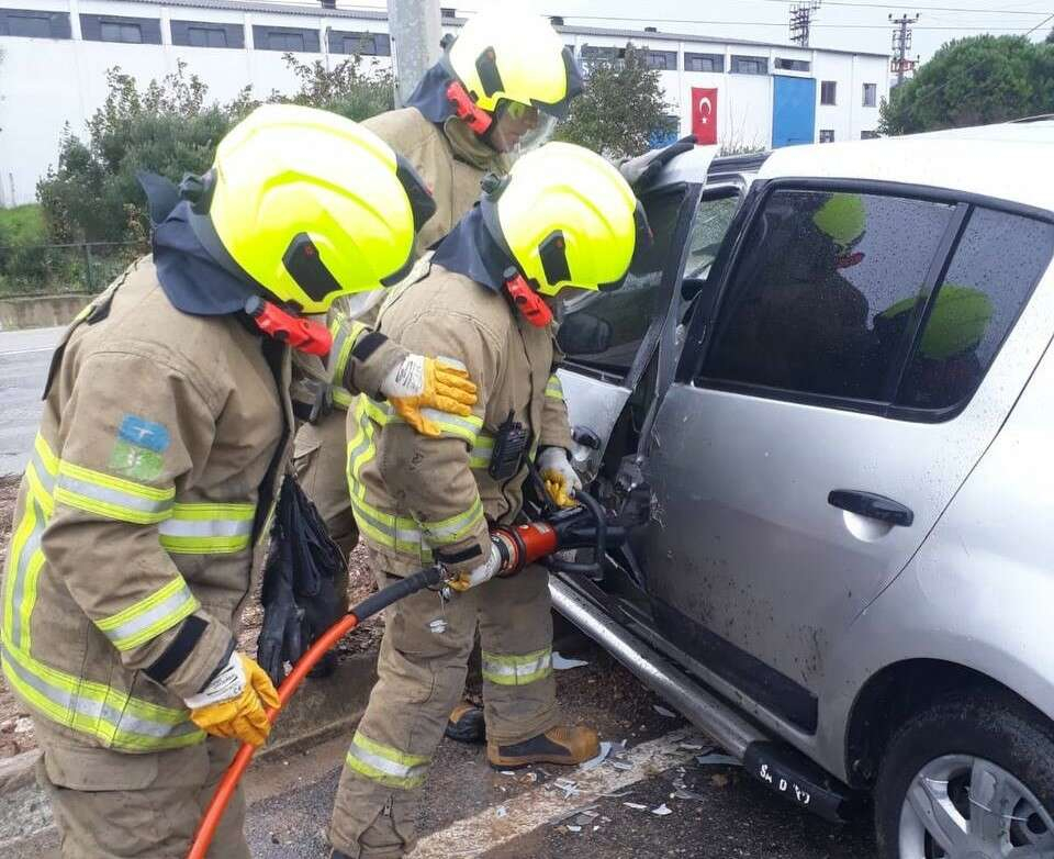 Direksiyon hakimiyetini kaybeden sürücü kaza yaparak aracın içinde sıkıştı.
