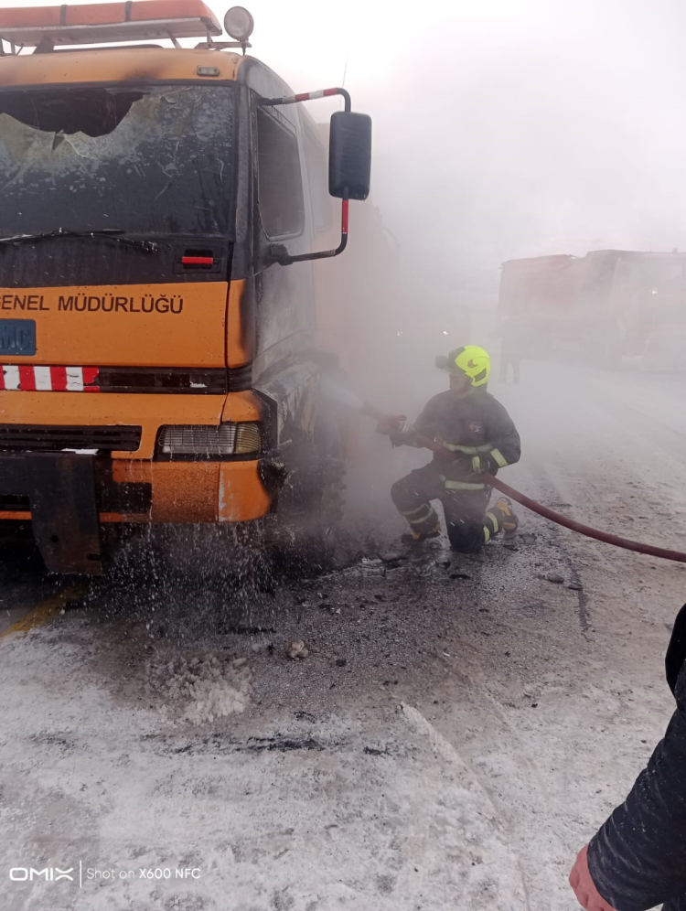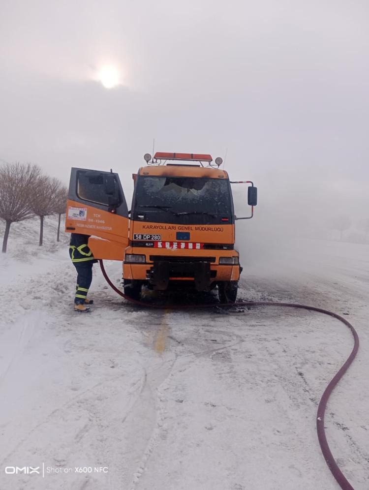 Sivas'ta seyir halindeki BMC marka karla mücadele kamyonu, yanarak kullanılamaz hale geldi.