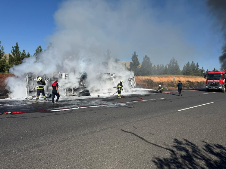Şanlıurfa'da kaza sonucu devrilen yakıt tankeri alev topuna döndü.