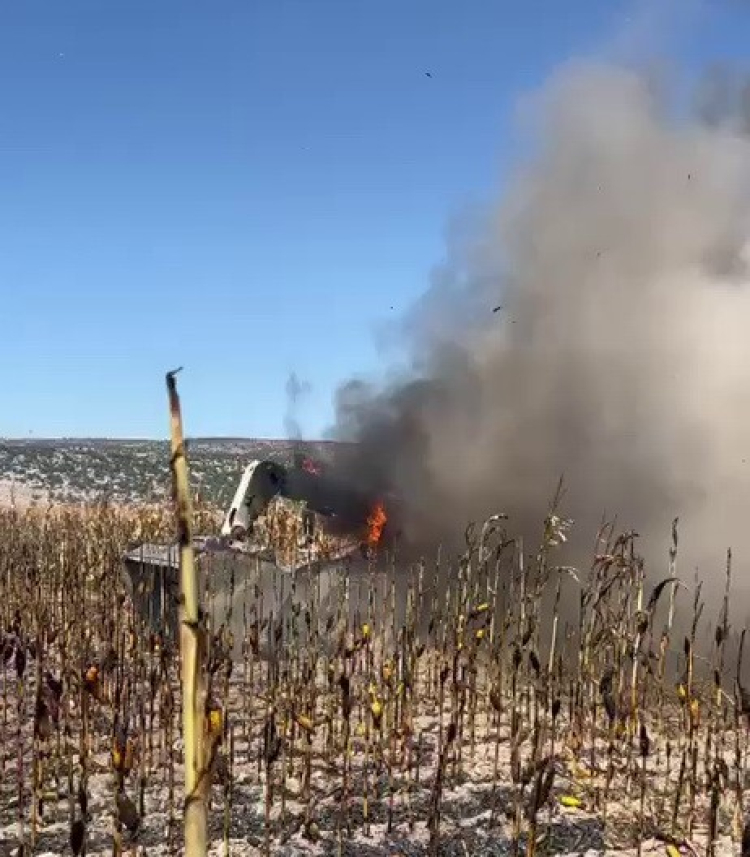 Adıyaman’ın Besni ilçesinde mısır tarlasında çıkan yangına müdahale etmek isteyen iş makinesi alevlerin arasında kalarak yandı.