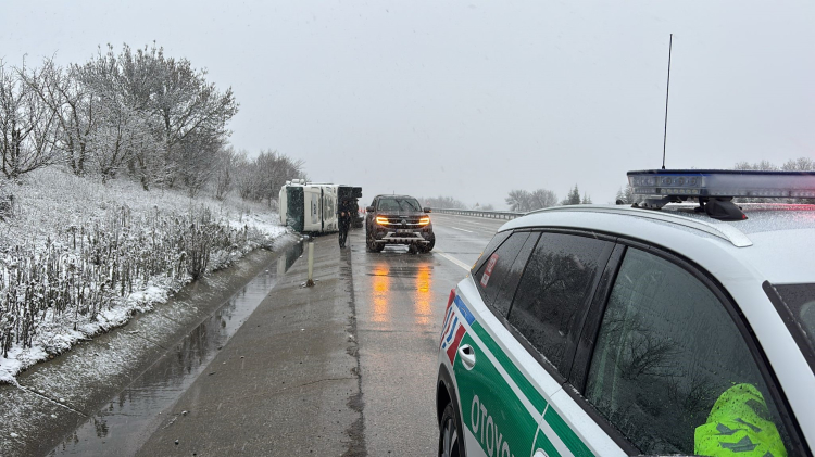 Edirne'den İstanbul istikametine giden tır, Babaeski mevkisinde kar yağışı sebebiyle yolun kaygan olmasından dolayı yoldan çıkarak devrildi.