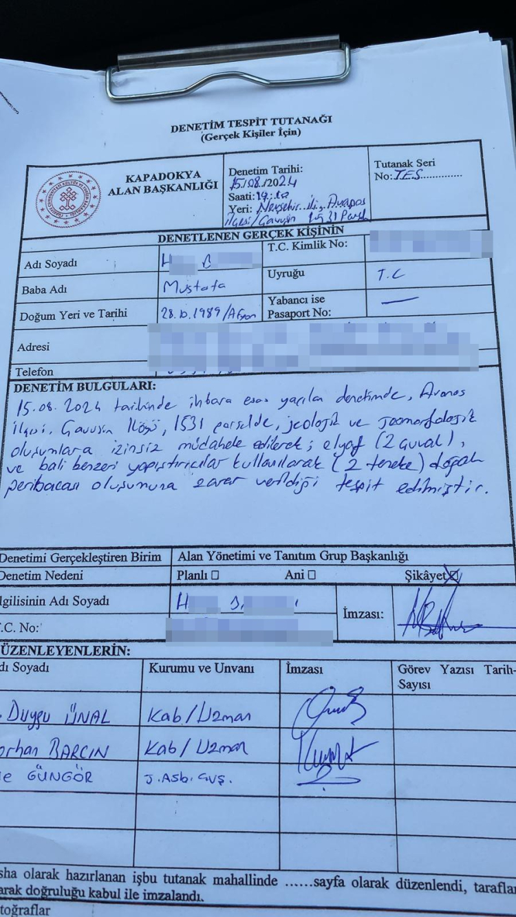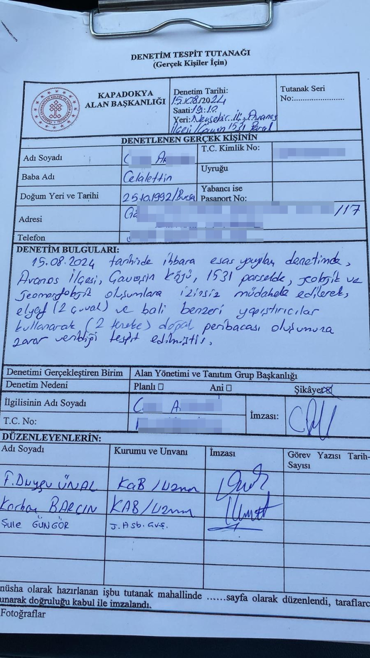 Kültür ve Turizm Bakanlığına bağlı Kapadokya Alan Başkanlığı tarafından yapılan denetim tespit tutanağı ortaya çıktı. Tutanağa göre, Avanos ilçesi Çavuşin kasabasında H.B. ve C.A. çekim yaparken, vatandaşların şikayeti üzerinde jandarma çekim yapılan alanı denetledi. Denetim sonucunda 2 kişinin ‘bali benzeri yapıştırıcılar' kullanarak doğal peribacası oluşumuna zarar verdiği tespit edildi.