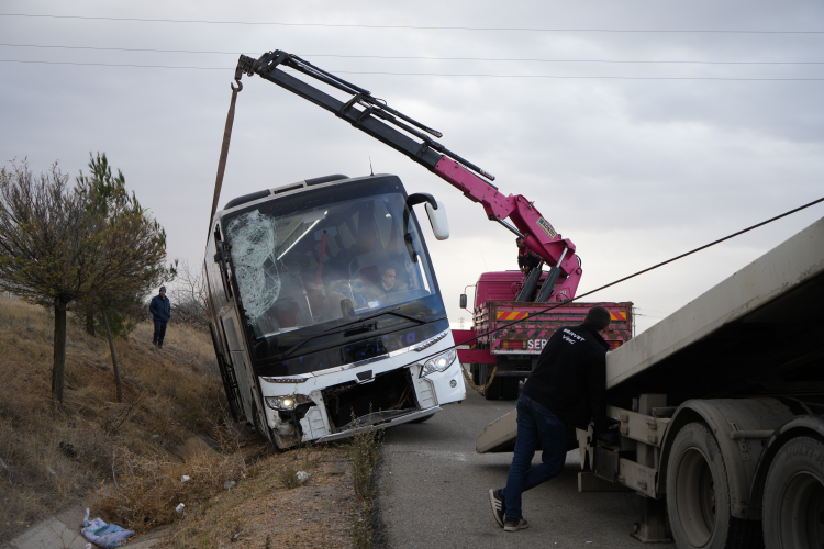 Kırıkkale'de kontrolden çıkan otobüsün şarampole yan yatması neticesinde meydana gelen kazada 27 yolcu ve 3 personel yara almadan kurtuldu.