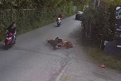 Başını asfalt zemine çarpan sürücü ağır yaralanırken, o anlar güvenlik kamerasına yansıdı.