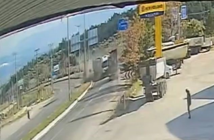 Meydana gelen feci kazanın görüntüleri ortaya çıktı. Karayolu üzerinde faaliyet gösteren bir akaryakıt istasyonunun güvenlik kamerasına yansıyan görüntülerde tırın kontrolden çıkarak, karşı şeride geçip karşı yönde gelen tıra çarptığı anlar yer aldı.