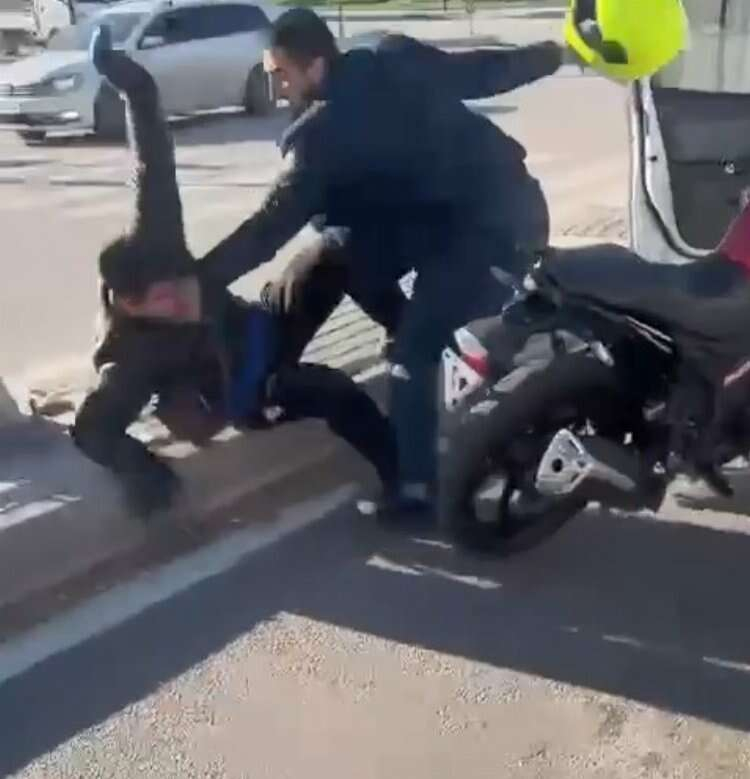 Tartışmanın büyümesiyle otomobil sürücüsü kaskını aldığı motosiklet sürücüsüne kaskıyla vurmaya başladı.