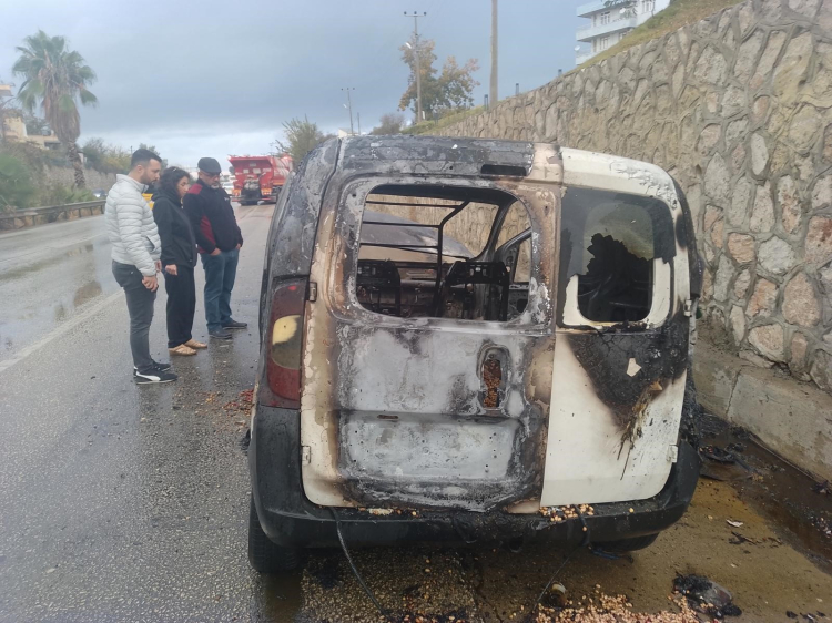 Antalya'da seyir halindeki kuruyemiş yüklü hafif ticari bir araç alev alarak yandı.