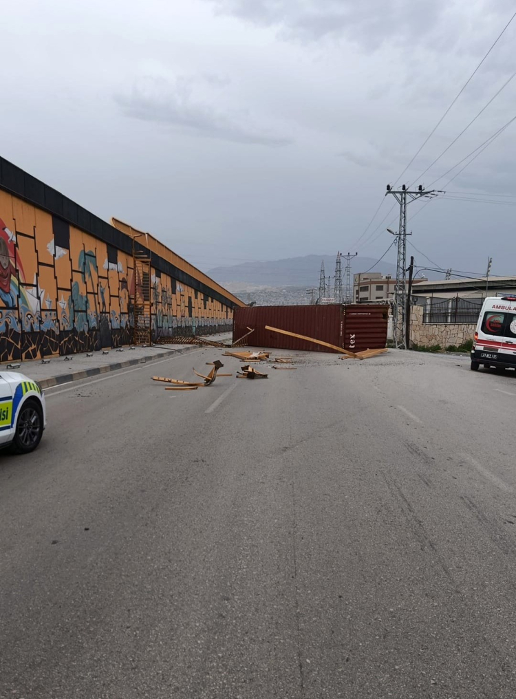 Hatay'ın İskenderun ilçesinde kuvvetli fırtına seyir halindeki tırda taşınan yük konteynerini yola uçurdu.