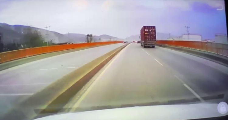 Olayda yaralanan olmazken, konteynerin tırdan yola uçtuğu anlar araç kamerasına yansıdı.
