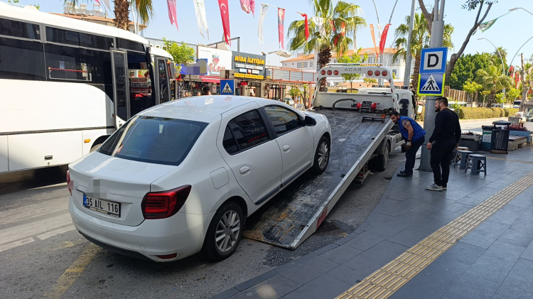 Manavgat'ta minibüs durağına bırakılan ve yaklaşık 2 saat alarmı çalmasına rağmen sahibine ulaşılamayan otomobil, çekici ile yediemin otoparkına çekildi.