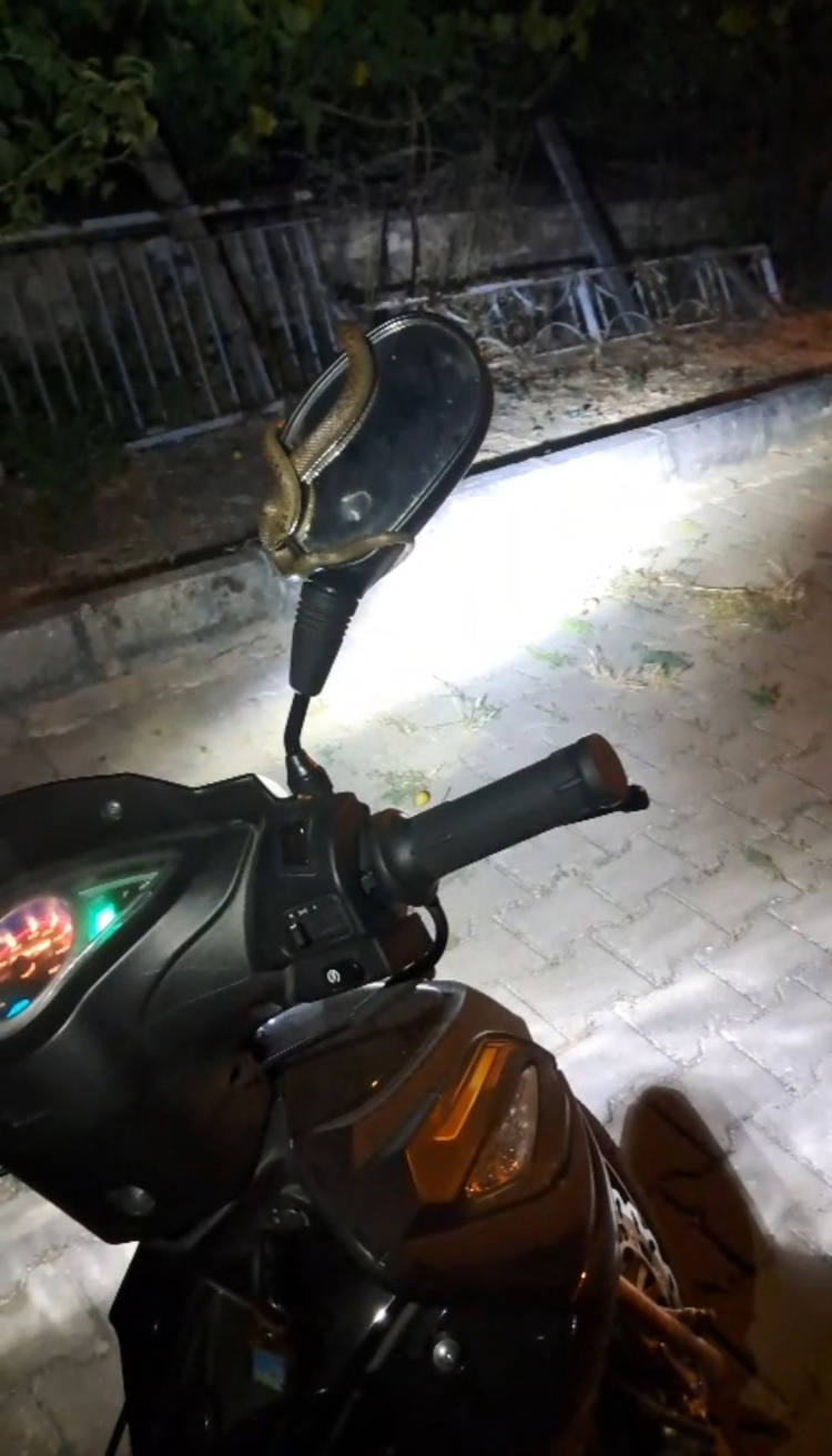 Olay, ilçeye bağlı Karşıyaka Mahallesi'ndeki Osman Gazi Camii yakınlarında yaşandı. Park halindeki motosikletin direksiyon kısmına giren yılanı fark eden sürücü Erdem Sarıca, aracı kullanmaktan vazgeçti. O anlarda herhangi bir tehlike yaşanmazken, çevrede toplanan vatandaşlar da şaşkınlıkla durumu izledi.