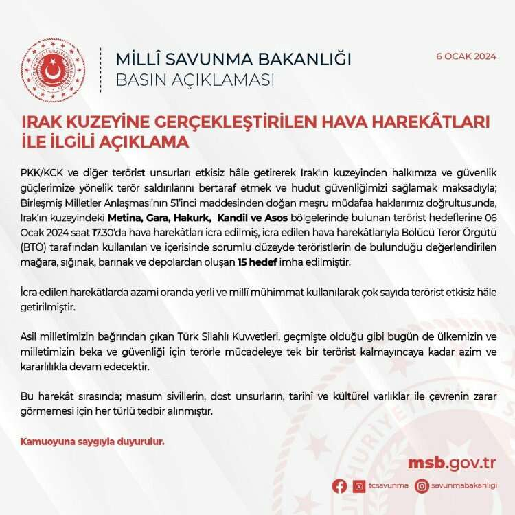 Milli Savunma Bakanlığı, Kuzey Irak’a yapılan hava harekatlarına ilişkin sosyal medya hesabından açıklama yaptı. Açıklamada, Birleşmiş Milletler (BM) Anlaşması’nın 51’nci maddesinden doğan meşru müdafaa hakları doğrultusunda Irak’ın Kuzeyindeki Metina, Gara, Hakurk, Kandil ve Asos bölgelerinde bulunan terör hedeflerinin vurulduğuna dikkati çekilerek, “6 Ocak 2024 saat 17.30’da hava harekatları icra edilmiş, icra edilen hava harekatlarıyla bölücü terör örgütü tarafından kullanılan ve içerisinde sorumlu düzeyde teröristlerinde bulunduğu değerlendirilen mağara, sığınak, barınak ve depolardan oluşan 15 hedef imha edilmiştir” ifadesi kullanıldı.