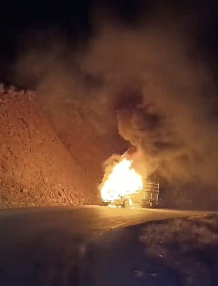 Üçevler grup köy yolunda plakası öğrenilemeyen seyir halindeki bir kamyonet aniden alev alarak yandı. Henüz kimliği öğrenilemeyen sürücü, can havliyle kendini araçtan dışarı atarak yanmaktan son anda kurtuldu.