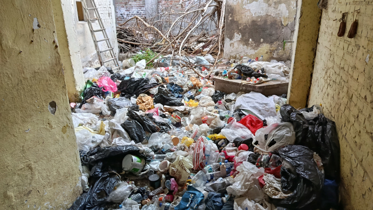 Adana'da kötü koku ihbarı üzerine girilen böceklerin sardığı bir müstakil evden, 2 kamyonet dolusu çöp çıkartıldı.