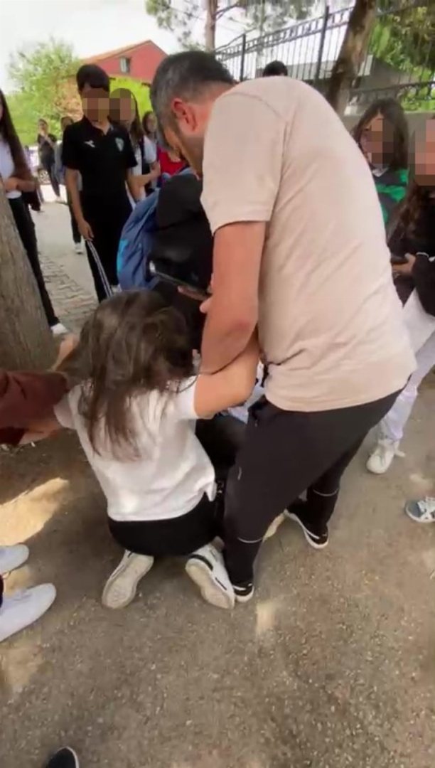 Ortaokul öğrencisi 2 kız saç saça baş başa kavga etti. Bu anlar başka bir öğrenci tarafından saniye saniye kayda alındı.