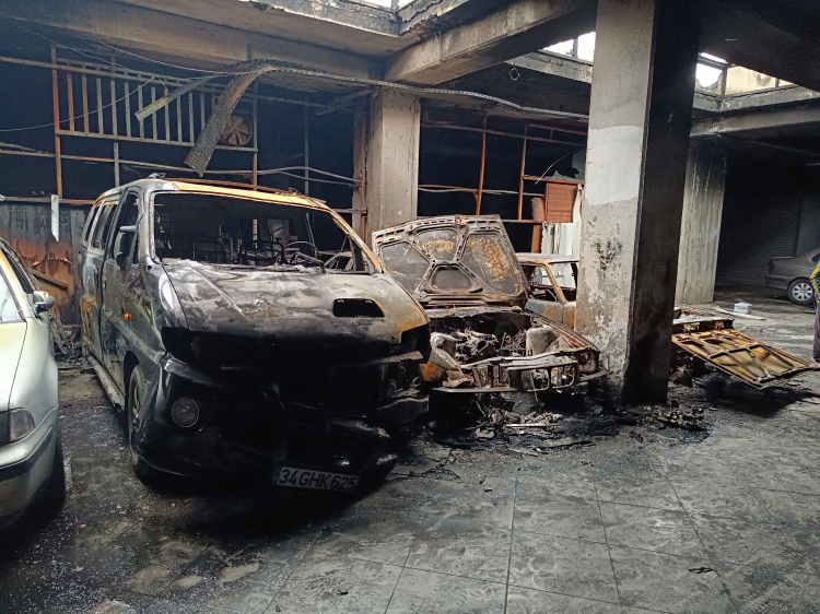Sancaktepe'de bir oto galericiler sitesinde bulunan iş yerinde gece saatlerinde çıkan yangın nedeniyle iş yeri ve 7 araç yandı. Yangının geride bıraktığı hasar gün aydınlanınca ortaya çıktı.