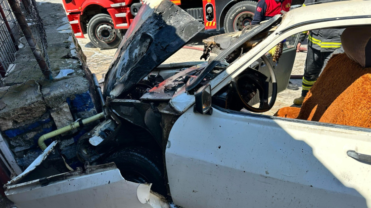 Alev alan otomobil, itfaiye ekiplerinin müdahalesiyle söndürülürken, kazayla ilgili inceleme başlatıldı.