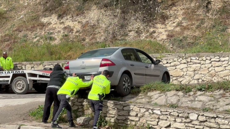Kaza, Deretarla Sokak'ta meydana geldi. Sürücüsünün kontrolünden çıkan otomobil 1 metre yüksekliğindeki duvarda asılı kaldı. İhbar üzerine gelen trafik polisi ekipleri, çekici çağırdı. Sürücüyü direksiyon başına geçiren ekipler, otomobili arkadan iterek alt yola düşmekten kurtardı. Kazayı yara almadan ve aracında hasar oluşmadan atlatan sürücü polislere teşekkür etti.