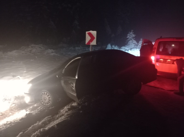 Bolu'da gizli buzlanma sebebiyle kontrolden çıkan otomobil şarampolde asılı kaldı.