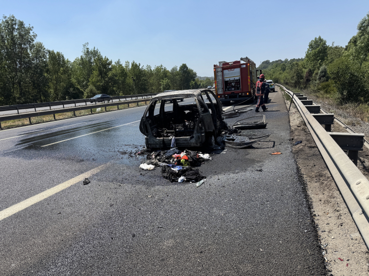 Anadolu Otoyolu Sakarya geçişinde seyir halindeyken alev alev yanan yabancı plakalı otomobilden geriye, demir yığınları kaldı.