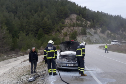 Burdur’un Bucak ilçesi Antalya-Isparta karayolu üzerinde seyir halindeyken alev alan ve motor kısmı yanarak büyük hasar gören otomobil itfaiye ekipleri tarafından söndürüldü.