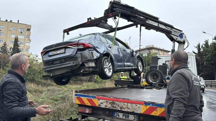 İstanbul'un Beşiktaş ilçesinde yağmur nedeniyle kayganlaşan yolda aracının direksiyon hakimiyetini kaybeden sürücü, kaldırıma çıktıktan sonra takla atarak şarampole uçtu.