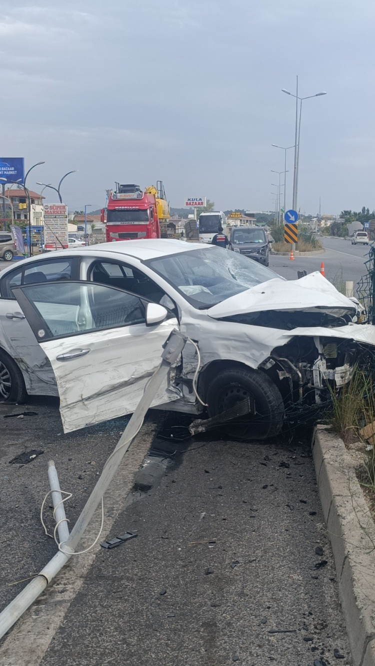 Antalya'nın Manavgat ilçesinde hafif ticari araç ile çarpışan otomobil, trafik tabelası, aydınlatma direği ve çelik telleri altına alıp orta refüje çarparak durabildi.