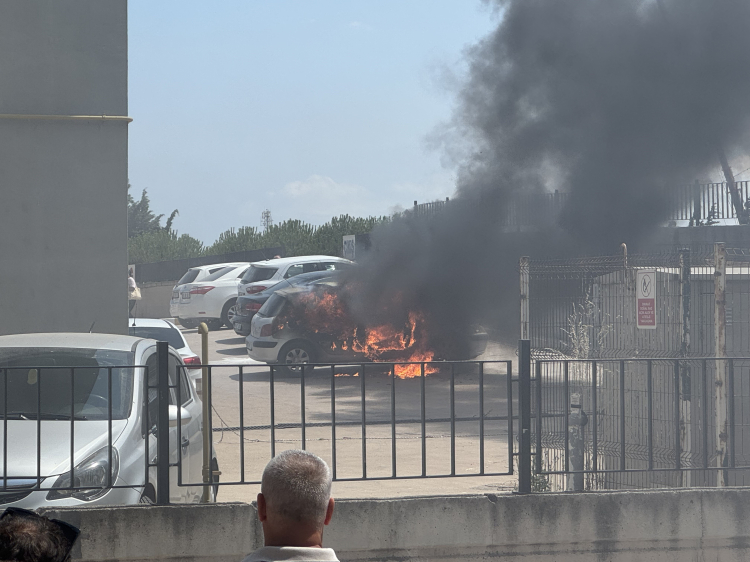 Balıkesir'in Bandırma ilçesinde hastane otoparkında park halinde bulunan otomobil alev aldı.