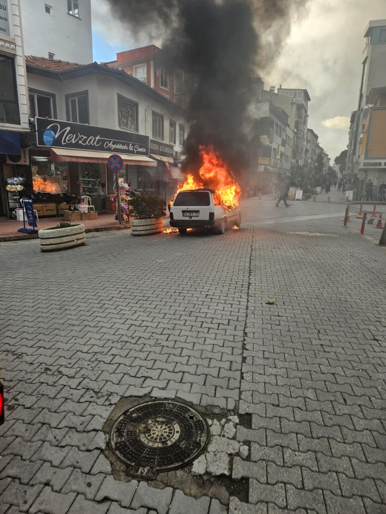 Dakikalar içinde otomobilin iç mahallindeki dumanlar, yerini alevlere bıraktı. Çevredekilerin endişeyle izlediği araç, adeta alev topuna döndü.