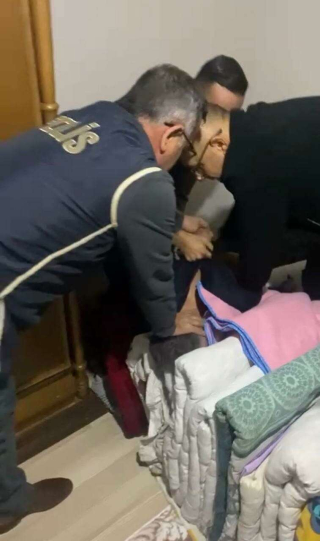 Drone destekli operasyonda kapılar koçbaşlarıyla kırılıp şüphelilerin evlerine girildi. Hırsızlık suçundan aranan ve 13 yıl kesinleşmiş hapis cezası bulunan Levent İ. saklandığı yorganların arasında polis ekiplerince fark edilip yakalandı.