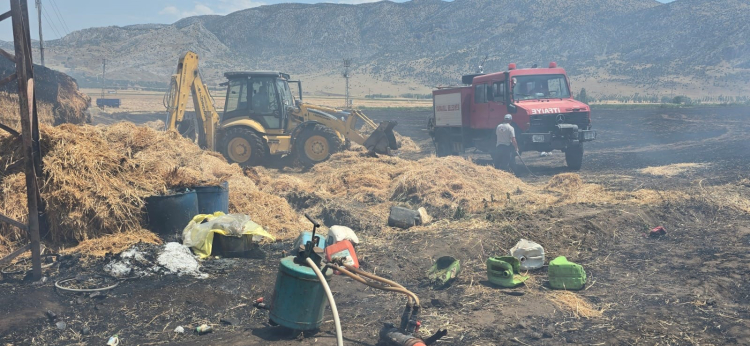 Afyonkarahisar’ın Şuhut ilçesinde saman balyası yüklü tırın elektrik tellerine temas etmesiyle çıkan yangında araç küle dönerken, araziye sıçrayan yangın itfaiye ekiplerinin ve vatandaşların yoğun çabasıyla büyümeden söndürüldü.