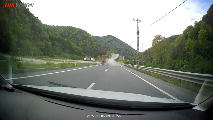 Araç kamerası görüntülerinde, patlayan lastiğin ardından tırın kısa süreli savrulduğu, ancak sürücünün aracı kontrol altına alarak yolun sağına yanaştığı görülüyor. Olayda herhangi bir yaralanma meydana gelmezken, sürücüler kısa süreli panik yaşadı.