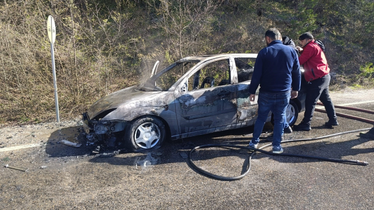 Alevleri fark eden sürücü aracını yol kenarına park edip, durumu 112 Acil'e bildirdi. İhbarla kısa sürede olay yerine gelen itfaiye ekipleri aracı saran alevlere müdahale etti. Söndürülen yangında sürücü yara almazken otomobil kullanılamaz hale geldi.