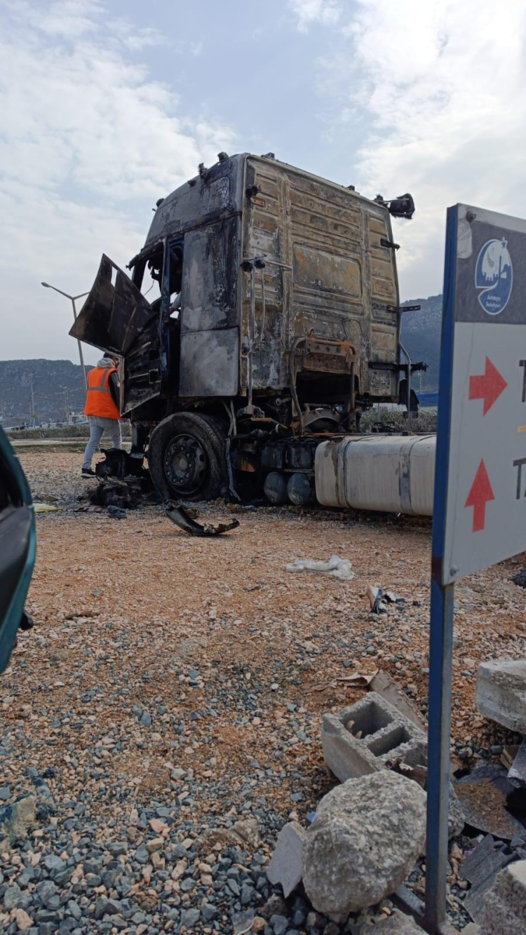 Yangın, Antakya ilçesi Kavaslı Mahallesi’nde yaşandı. Seyir halindeki hafriyat kamyonu kısa sürede alevlere teslim oldu.