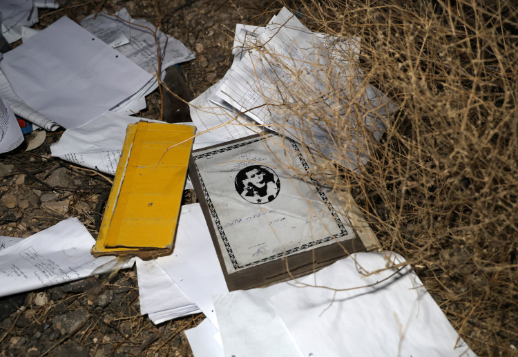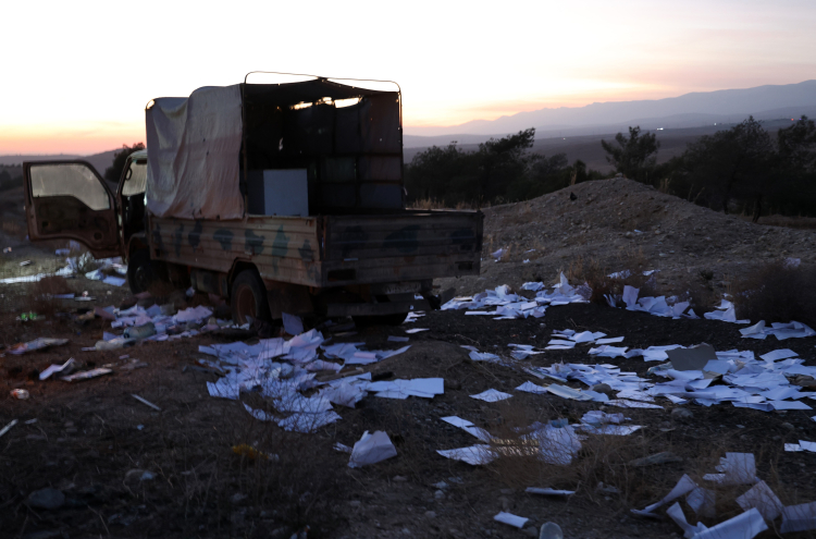 Suriye'de M5 karayolunda terk edilmiş halde duran bir askeri araçtan yol kenarına saçılan binlerce sayfa askeri evrak bulundu.