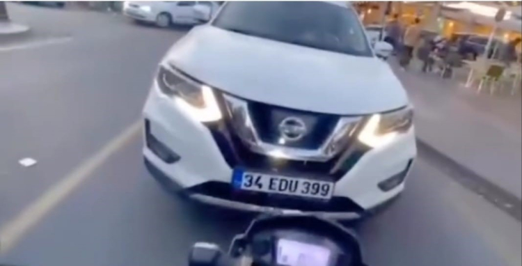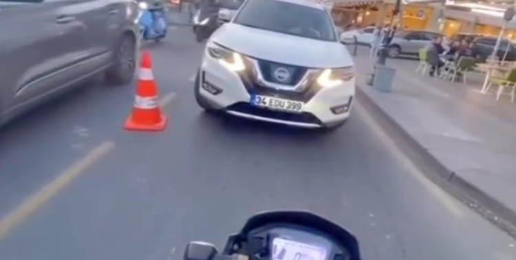 Motosikletli, "Git geri, plakan çıkacak, ceza gelecek. Hadi diye geliyorsun, öyle bir şey yok. Duba var, çekilmiyorum. Geri gidip oradan döneceksin" diyerek sürücüye tepki gösterdi. Otomobil sürücüsü ise aracından inerek motosikletlinin üzerine yürüdü ve "Bilmiyor olabilirim, buradan gelmeyeceksin. Herkes oradan geliyor" şeklinde konuştu.