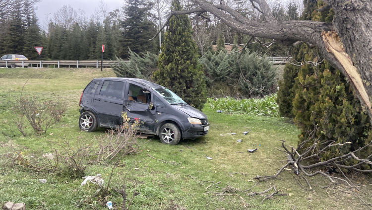 İki ağacı deviren otomobil, yeşillik alana devrildi. Sürücü kazadan yara almadan kurtuldu.