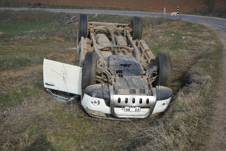 Edirne’de yoğun sis sebebiyle görüş mesafesi düşen pikap sürücüsü direksiyon hakimiyetini kaybederek takla atıp ters durdu.
