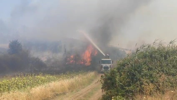 Tekirdağ'ın Şarköy ilçesinde başlayan orman yangını rüzgarın etkisiyle büyüyerek evlere ve tarım arazilerine sıçradı, 2 mahalle tahliye edildi.