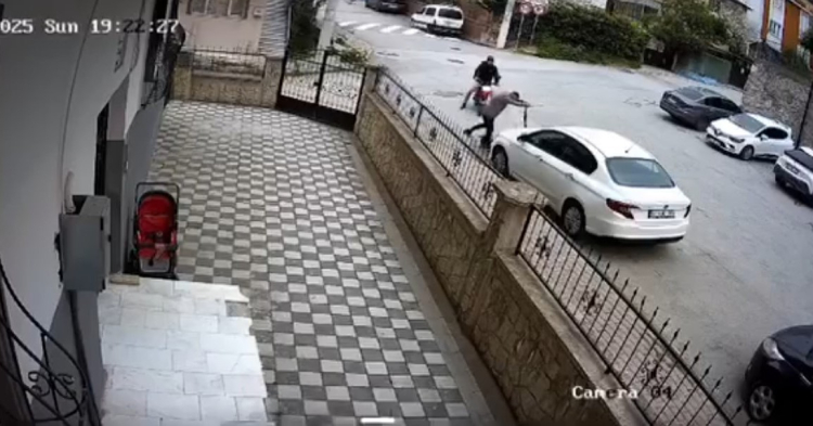 Sürücünün yere düştükten sonra kalkarak önce ters istikamete koştuğu, ardından unuttuğu scooterini hatırlayıp geri döndüğü ve olay yerinden uzaklaştığı anlar saniye saniye güvenlik kamerasına yansıdı.