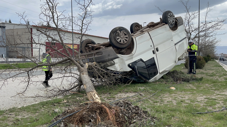 Elazığ’da sürücüsünün direksiyon hakimiyetini kaybettiği araç refüje çıkarak ağaca çarpıp takla attı.