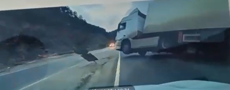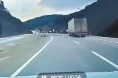 Kütahya'da tırın otomobilin üzerine devrildiği ve 1 kişinin öldüğü, 1 kişinin de yaralandığı trafik kazası araç kamerası tarafından saniye saniye görüntülendi.