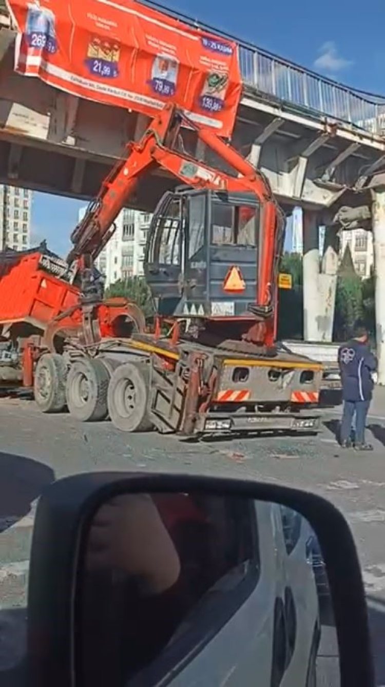 Avcılar'da iş makinesi taşıyan tır, üstgeçide çarptı