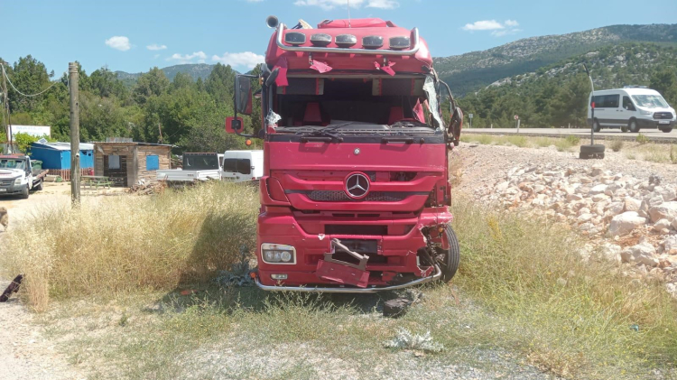 Antalya'da kontrolden çıkan demir profil yüklü tırın devrilmesi sonucu meydana gelen trafik kazasında tırın çekicisinin altında kalan 25 yaşındaki sürücü hayatını kaybetti.