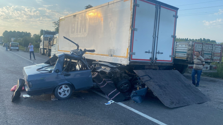 Tofaş marka otomobil, hakimiyetini kaybedip kamyona çarpma sonucu kağıt gibi yırtıldı. 1 kişi hayatını kaybederken 3 kişi ağır şekilde yaralandı.