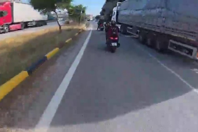 Antalya'da bir tır sürücüsü, aracı trafikte kendisine korna çalan motosiklet sürücülerinin üzerine kırarak, sürücüleri defalarca ölümle burun buruna getirdi.