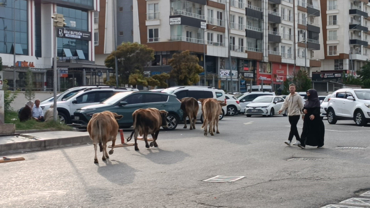 Şehir merkezinde, alışılmadık bir manzara sergileyen inekler, yola çıkarak sürücüler ve yayalar için şaşkınlık verici anlar yaşattı. İnekler, bir süre ana cadde üzerindeki araç trafiğinin akışını yavaşlatarak kısa süreli bir aksaklığa ve tehlikeye neden oldu.