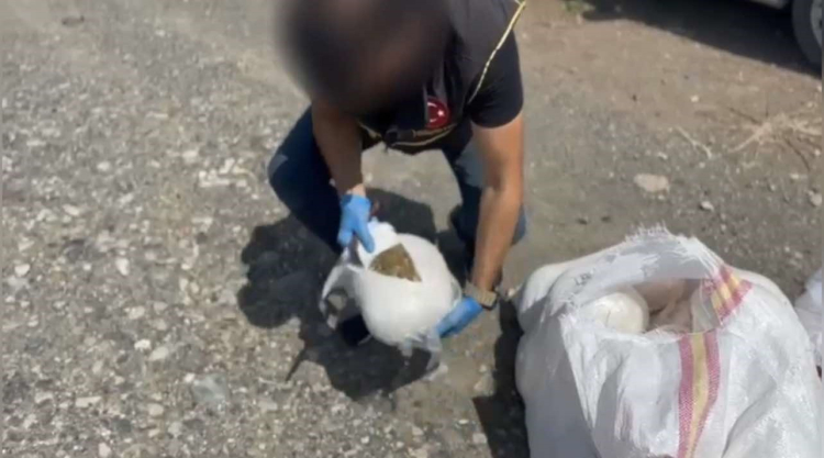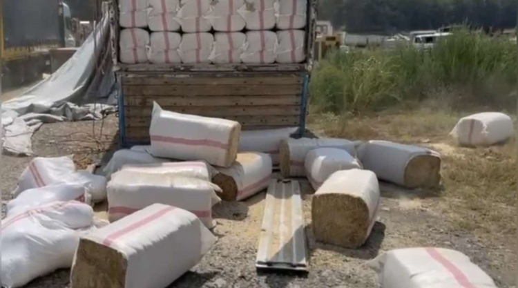 Hassas burunlu narkotik köpekle birlikte yapılan aramada kamyonda yüklü saman balyalarının arasında, 57 kilo 850 gram skunk maddesi, 2 ruhsatsız tabanca, 22 fişek ele geçirildi.