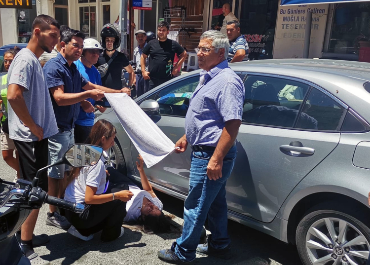 Muğla’nın Menteşe ilçesinde meydana gelen trafik kazasında yaralanan kadın motosiklet sürücüsü, çevredeki vatandaşlar tarafından sıcaktan korunması için havlu ile gölgelendi.
